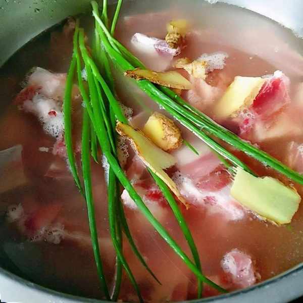 廚師長說,隻加3樣調料即可,就是大蔥、生薑、食鹽。把焯水後的排骨倒進湯鍋裡,加入適量開水沒過排骨,加入蔥段、薑片,大火煮開後小火燉1個小時,再加適量鹽燉半小時即可。