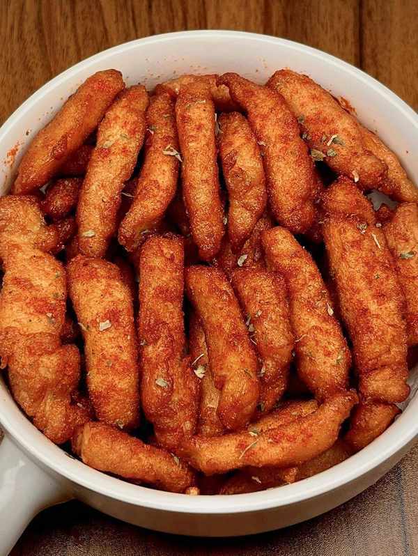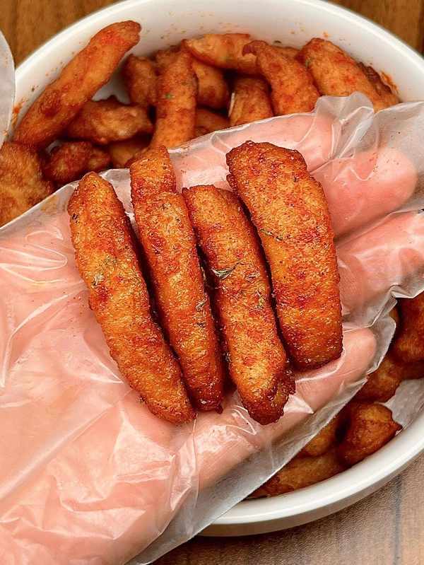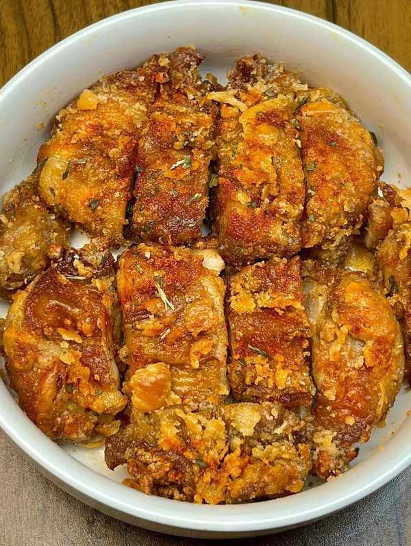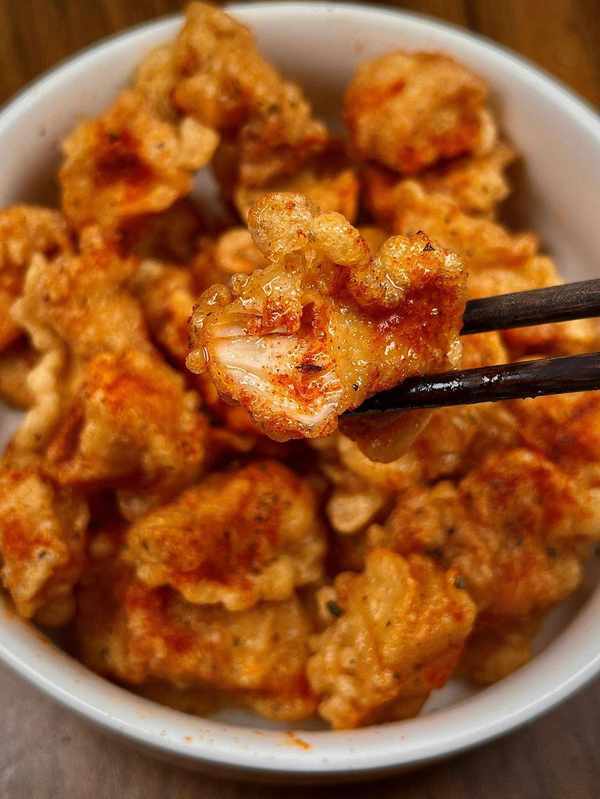 ②油熱下雞胸肉炸至微黃撈出,再放入復炸至金黃撈出,撒上歐芹碎和辣椒粉拌勻即可。