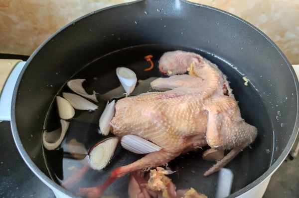 2.洗凈的鴿子入湯煲中,添入沒過鴿子的清水,加入大塊的蔥薑和黃酒,然後大火燒開,把飄在表面的浮沫撇幹凈,然後轉小火慢燉。