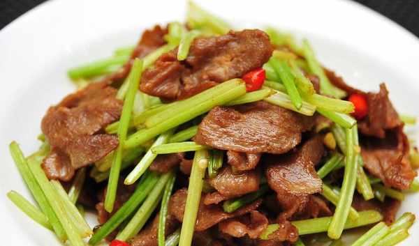 5、開始不停翻炒,把牛肉快速劃散,直至牛肉炒至變色之後,我們把香菜給倒進去。繼續翻炒幾下,將其炒軟為止,隨後放上適量的鹽和雞精,再來一點點生抽和蠔油,炒勻以後關火出鍋即可。