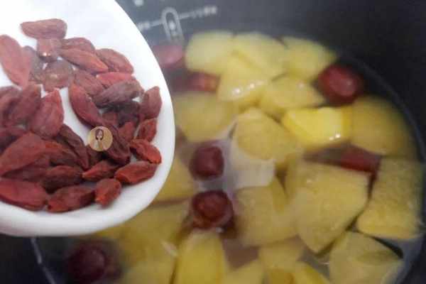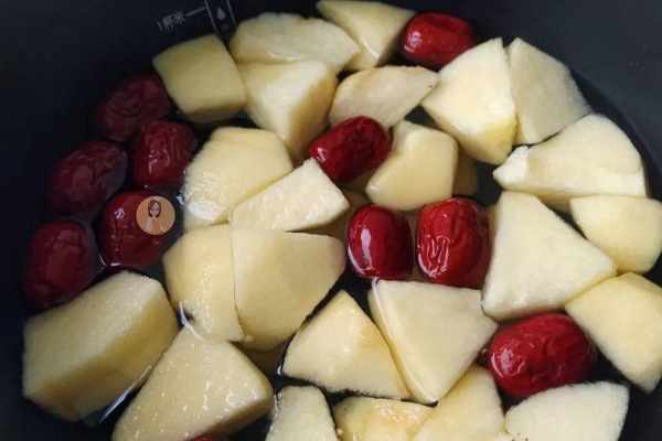 步驟蘋果去皮切塊,和板栗、紅棗一起丟進電飯煲裡。