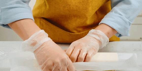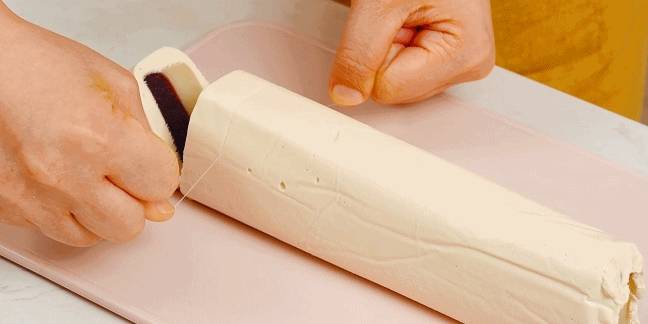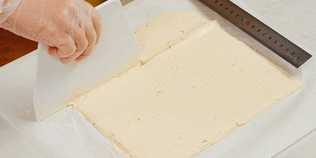 6、奶酪中間放上疊好的豆沙,用奶酪將豆沙包起來,冷藏30分鐘定型
