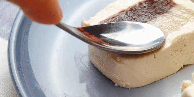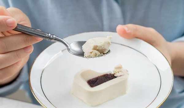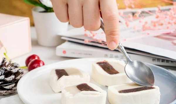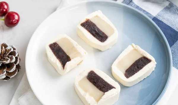 奶白的奶酪,包裹著另一重暖白的豆沙,兩種白色在黑色的襯托下,倒也十分和諧,用勺子微微一壓,絲滑感都能從勺尖傳遞到心裡。