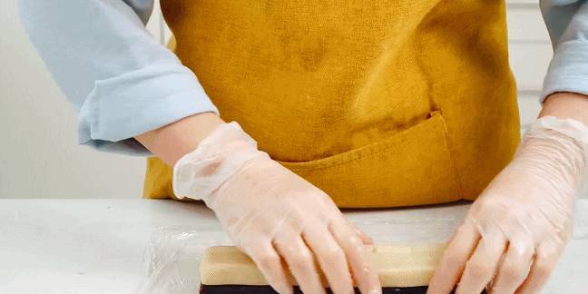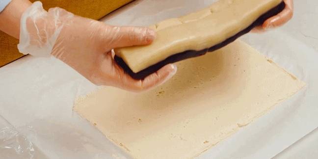 3、125g白豆沙和125g紅豆沙整形成大小一致的長方體,疊在一起