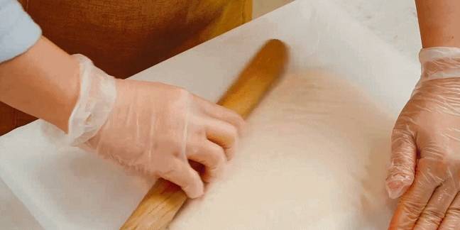 5、鋪在油紙上,搟成薄片(厚約8mm),去掉邊緣