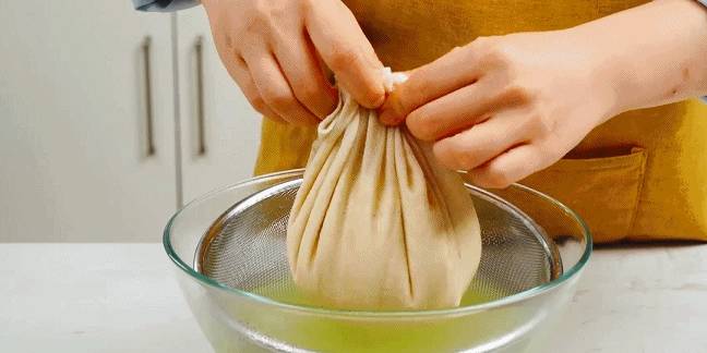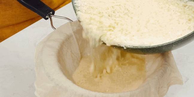 2、靜置10分鐘,用紗佈過濾出奶酪,濾幹水分備用