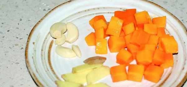 3、將芒果切小丁,蒜去皮,薑切片備用。