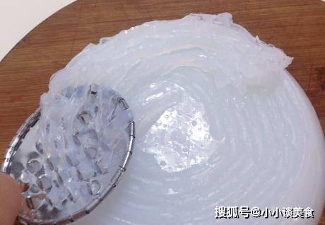 第三步,把粉加熱到完全透明,沒有小氣泡,就說明涼粉熟瞭。關火後,放入容器中自然冷卻。之後,果凍會變硬;