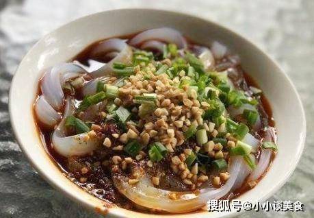 第五步,將磨碎的涼粉裝盤,加入花生碎、榨菜、蔥花、辣椒油、醋、糖等調料拌勻即可享用。