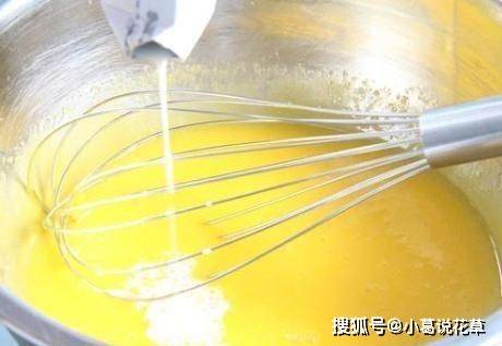 第一步,當所有的材料都準備好後,將雞蛋的蛋黃和蛋白分開,先在盛有蛋黃的容器中,用打蛋器打成液體,然後加入玉米油,攪拌均勻後放入牛奶;