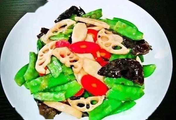 1.蓮藕去皮,荷蘭豆摘去老筋,黑木耳泡發,所有食材處理幹凈