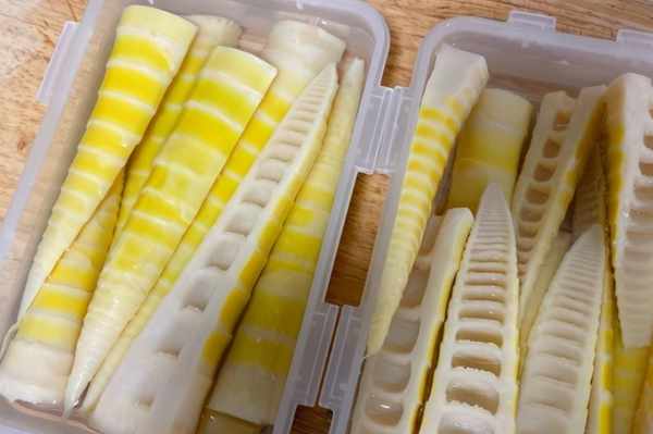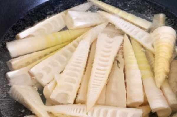 第五步、燒一鍋開水,加入一勺食鹽,放入處理好的春筍,再次煮開後用小火煮15分鐘,撈出後放涼。