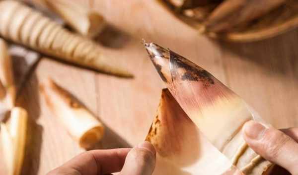 第二步、春筍買回傢後,要馬上處理,用刀從頂部使勁劃一刀,劃開後用手將筍衣扒下來,就露出裡面白嫩的筍瞭。筍衣雖然比較薄,但並不能吃,主角是筍。