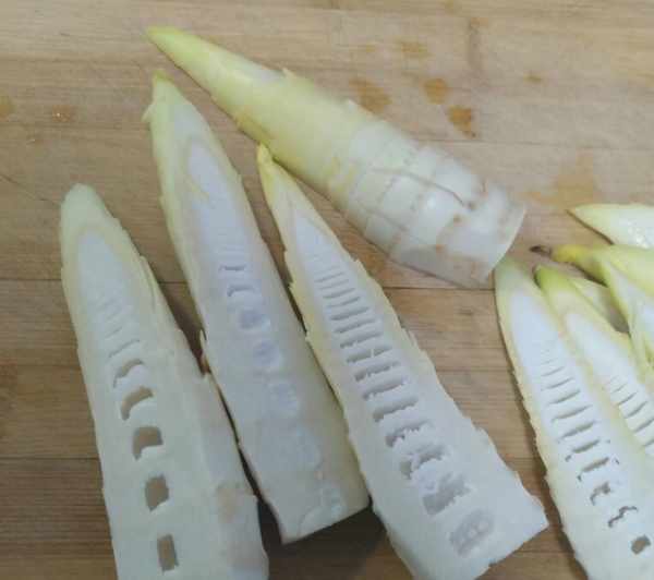第四步、將春筍對半切開,裡面有很多的筍節,告訴大傢一個技巧,筍節越多越密,春筍才越嫩。