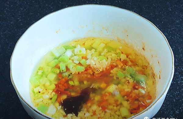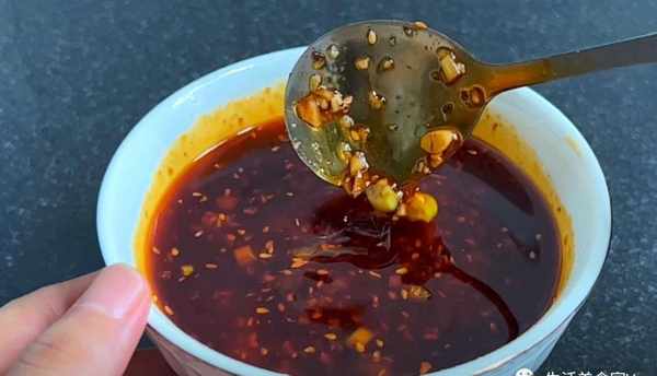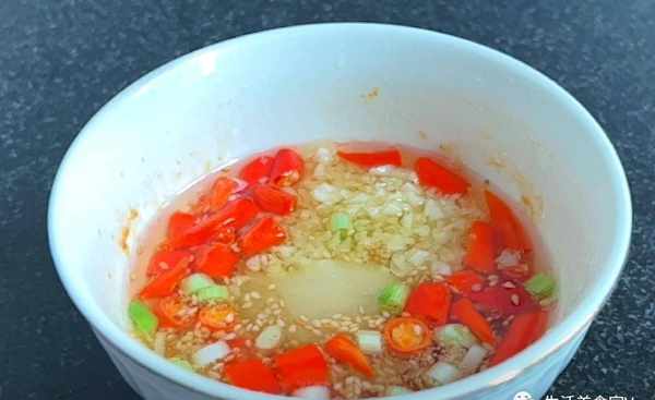 第5步、這時候備上一碗蘸料吧!先將蔥花蒜末辣椒淋入熱油爆香,在調味:食鹽,白糖,雞精,生抽,蠔油,香醋,香油,花椒油。