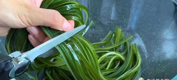 第5步、把煮好的海帶絲,撈出過2遍涼開水,涼透後撈出控幹水分,再用剪刀把它剪短一些即可。