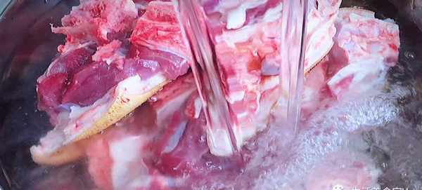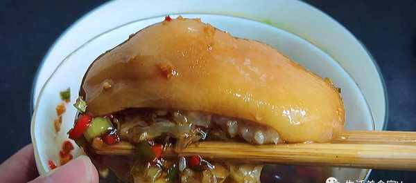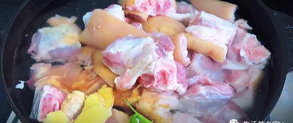 第2步、把豬蹄冷水下鍋,放入薑蔥和一點料酒,水開後把表面的浮沫去掉,再煮上8分鐘左右,就可以撈出用熱水清洗幹凈,隻有用熱水才能把表面的雜質和血沫清洗幹凈。