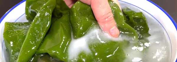 第1步、首先我們把海帶處理一下,把海帶放入碗中,再倒上一大碗的溫水,溫水50°左右就可以瞭,用溫水清洗能夠快速的將鹽份化開,還能去掉海帶的鹽味,然後清洗幹凈就可以瞭。