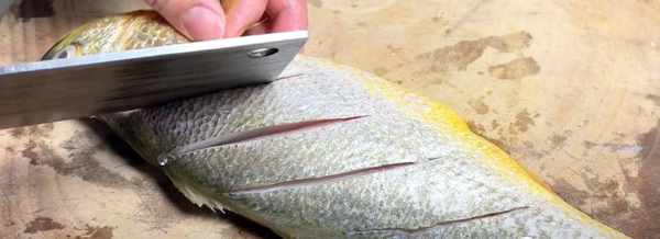第1步、首先把黃花魚的魚鱗和魚鰓去掉,然後魚肚裡面也要處理幹凈,再給兩面改上三四刀即可。