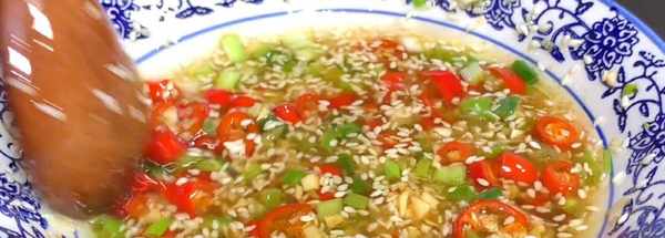 第4步、趁著海帶絲還在蒸煮,提前準備一碗料汁,準備蔥薑蒜米,辣椒,白芝麻,然後淋上熱油激發香味,再進行調味,一勺生抽,一勺陳醋,小勺食鹽,少許雞精,再來一點芝麻香油,攪拌均勻備用。