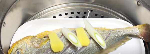 第4步、把醃制好的黃花魚清洗一下,然後放入蒸鍋中,加上點蔥薑片,鍋中水開後,煮上8分鐘即可。