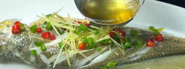 第5步、8分鐘後,黃花魚就蒸好瞭,把多餘的蔥薑去掉,還有多餘的水分也倒掉,然後撒上蔥花薑絲,辣椒,再淋上一勺熱油激發香味。