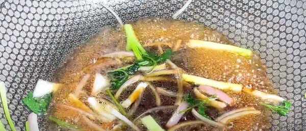第3步、然後做上一碗料汁,起鍋熱油,放上一點洋蔥段和香菜段,煸炒出香味再倒入一大勺清水,大半勺的蒸魚豉油,煮上2分鐘就可以撈出備用瞭。