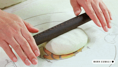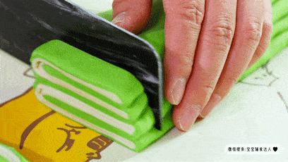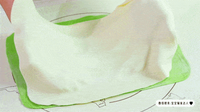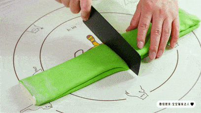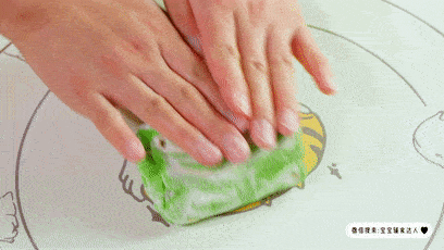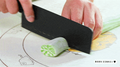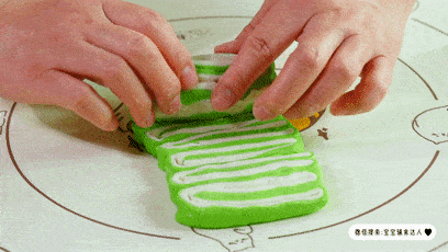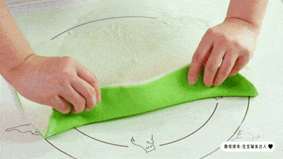 鋪好揉面墊,撒上幹粉防粘。和好的面團取出來,分別搟成綠色的和白色的長方形薄餅。這裡你們最好用那種帶刻度的揉面墊,這樣搟出來的薄餅大小,基本也差不多。