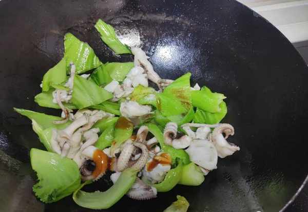 4.蓋菜下鍋炒個20來秒鐘之後我們把焯水後的魷魚倒入裡面,魷魚下鍋後用鏟子快速的翻炒。加入適量的食鹽跟蠔油調味一下,再用鏟子炒均勻,炒個20來秒鐘,就可以關火出鍋。