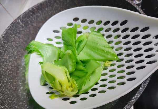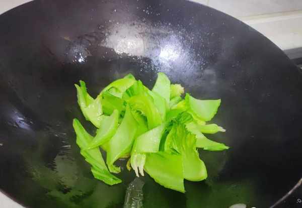 3.鍋裡面倒入油,將油燒熱。油熱瞭之後,我們把焯水後的蓋菜放在油鍋裡面,下鍋後,用鏟子多翻動一下,快速翻炒;