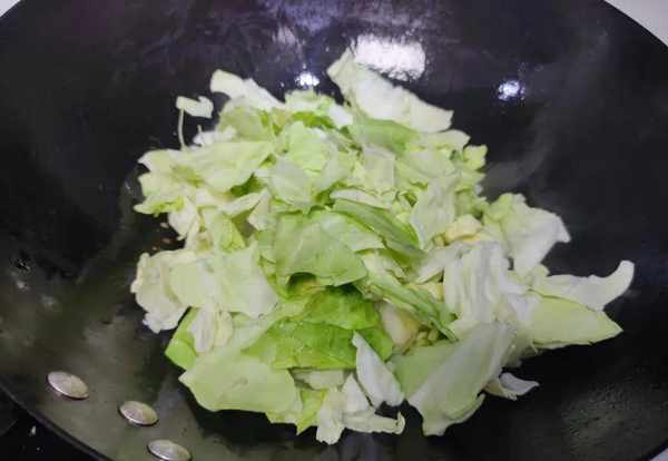 3.準備一個幹凈的炒鍋,鍋中的水分幹後倒入適量的油,魷魚幹倒入鍋中小火煸炒。魷魚幹炒香後將掰好的包菜倒入鍋中,包菜中含有的水分很高,下鍋後可以用大火快炒,鏟子要勤翻動;