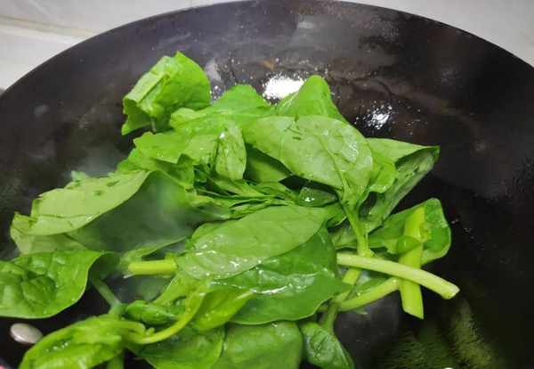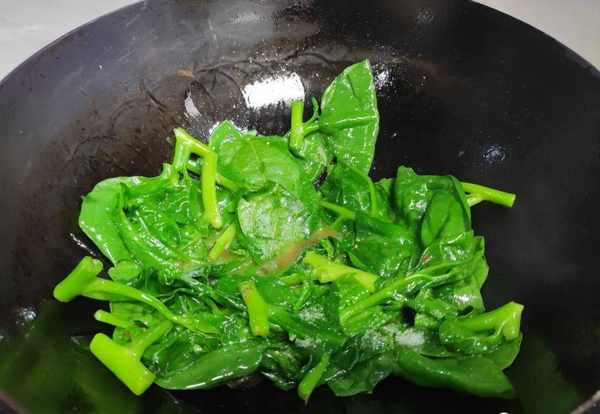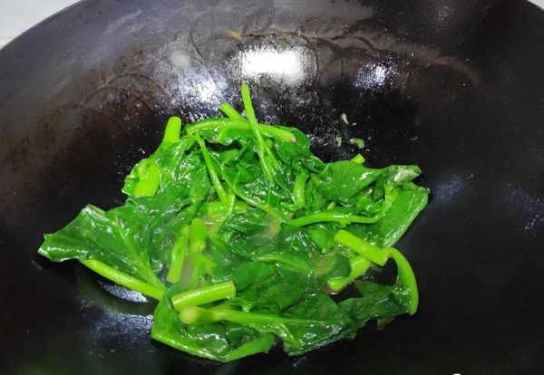 3.木耳菜下鍋之後一定要用鏟子快速翻炒,而且要多翻動。下鍋之後炒均勻,裡面的木耳菜很快就被炒至發軟,而且炒出來的顏色非常的翠綠好看;