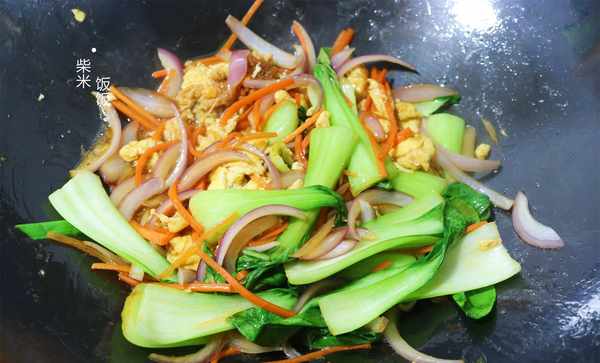 5,緊接著放入胡蘿卜絲、洋蔥絲、青菜,加鹽、生抽、蠔油、雞精調味,大火翻炒均勻。