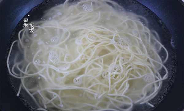 2,面條開水下鍋,煮熟撈出,再用涼水淘一遍,瀝幹水分。