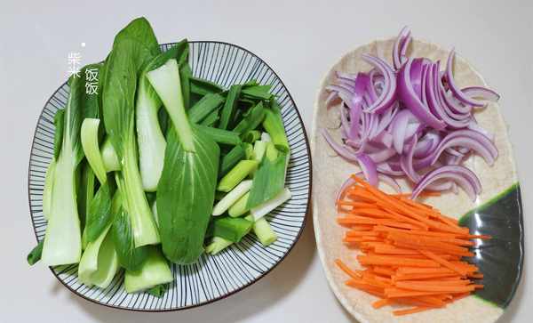 1,洋蔥切絲,胡蘿卜切絲。青菜洗凈,青蒜苗洗凈,切段。
