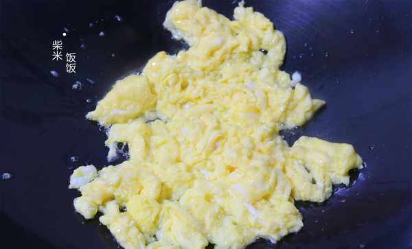4,雞蛋打入碗中充分攪散,熱鍋倒油,油熱後倒入雞蛋液,大火快速滑炒,將雞蛋炒熟。