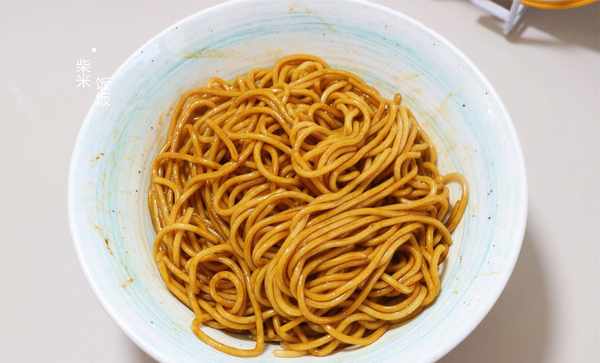 3,加一勺食用油、一勺老抽拌勻,這樣處理過的面條不粘不坨,也更入味。
