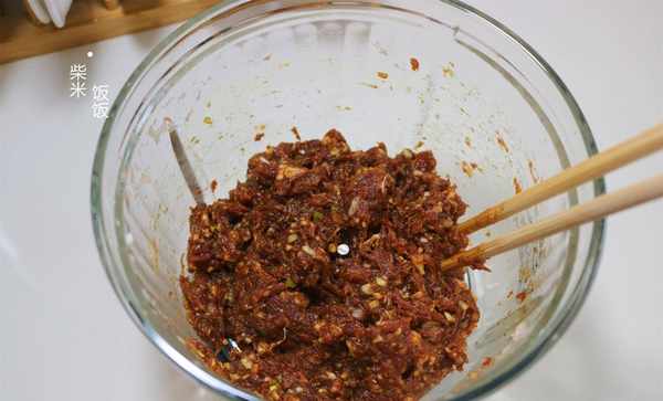2,豬肉洗凈,絞成肉餡,加蔥薑末、花椒粉、老抽、生抽,沿著一個方向充分攪拌均勻。