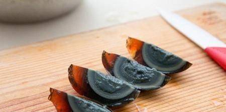 刀兩面抹油,然後把去皮的皮蛋放在案板上,一隻手拿著一半的皮蛋,再用另一把刀切開,這樣皮蛋會切得很深,雞蛋也會切的很深蛋黃會在刀片上著色。記住,油不要放太多,隻要塗在皮蛋接觸的地方就行。