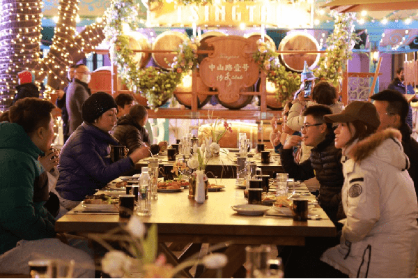 從杭州來青島旅行的小張和同學,在青島啤酒中山路壹號·傳奇CLUB尋得瞭一處啤酒桶造型的雅座,一人一瓶青島啤酒享受起海濱城市的夜景,“這是我們大學畢業之後的第一次旅行,下午遊覽瞭棧橋回瀾閣,傍晚又喝到瞭青島啤酒,工作人員介紹說青島啤酒的標志設計靈感正是源自棧橋回瀾閣,” 隨處可見的是青島啤酒元素與此起彼伏的幹杯聲,交織出這座城市的生活味道與文化符號。