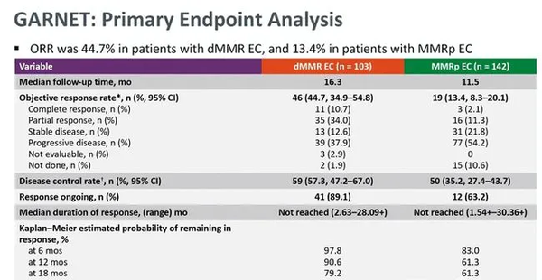 此外,研究人員還進行了另一項名為GARNET的臨床試驗,參與者包括所有類型的dMMR實體瘤患者(子宮內膜和非子宮內膜實體瘤)。
