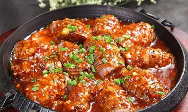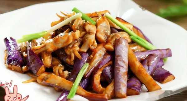 (4)凈鍋註油燒開,放入茄子、蟶子略炒。