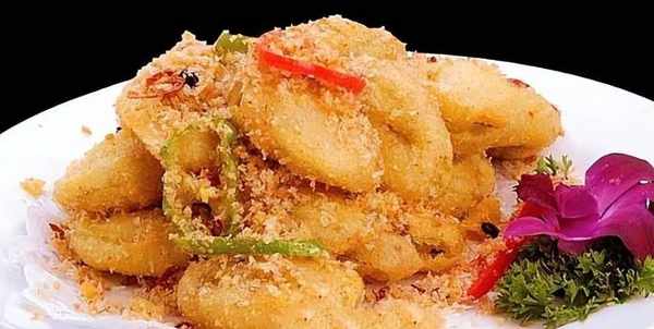 (3)將淀粉加入食鹽、水攪拌成糊狀,放入茄子混合,放入熱油鍋,炸至酥脆。