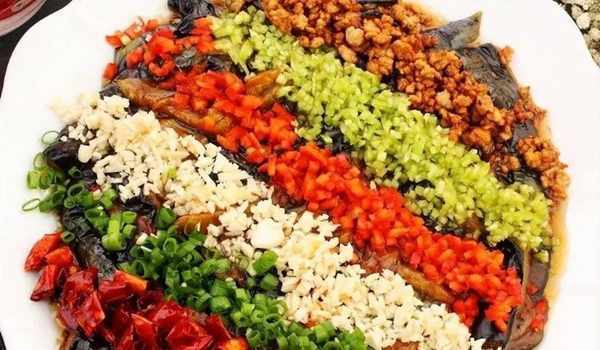 (1)將茄子去皮,洗凈,切條,放入蒸鍋蒸軟備用。