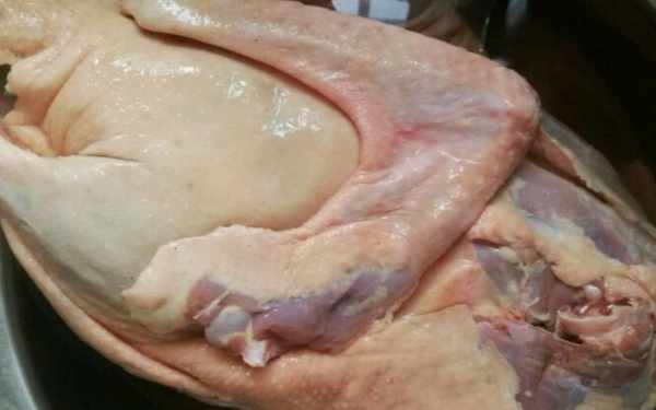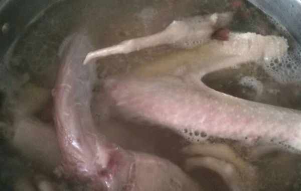 1、鵝宰殺後,去掉內臟,把頭、腳、翼切掉。