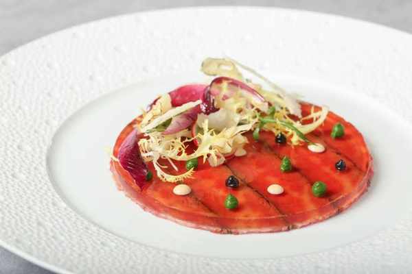 Crystal-clear cubes of beef consommé jelly enrich this delicate wagyu beef carpaccio, which is arranged on the plate in a beautiful ruby-red swirl.