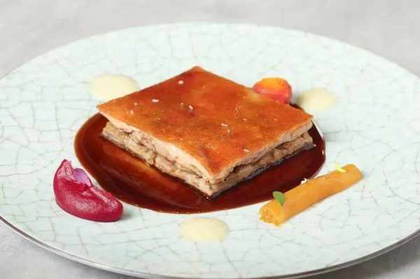 For this dish, Chef Marino has selected high-quality free range Bama pork from Mengzhaxi farm. The pork is marinated in lavender and sea salt, before being slow roasted for 14 hours. The resulting pork is meltingly tender with exceptionally crispy skin, perfect served with orange sauce and aged balsamic vinegar to balance out the richness.