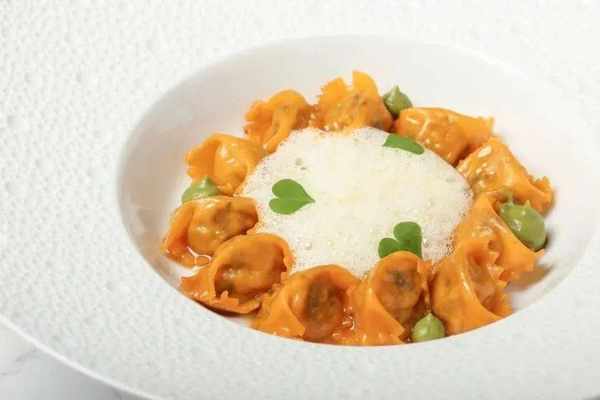 來自意大利北部皮埃蒙特地區經典的小方餃,帶有波浪形的小花邊。兩張面皮下內藏乾坤,本身的黃油香氣與小牛汁氤氳交織,輕輕一咬,香滑即在口中綻放。