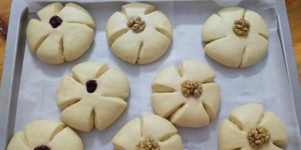 第12步:在發酵好的面包生坯上放上核桃或其他幹果。