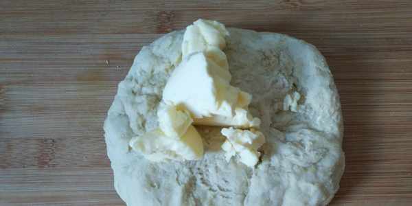 第5步:雞蛋與面團混合後,接著把黃油也揉入面團裡均勻混合。